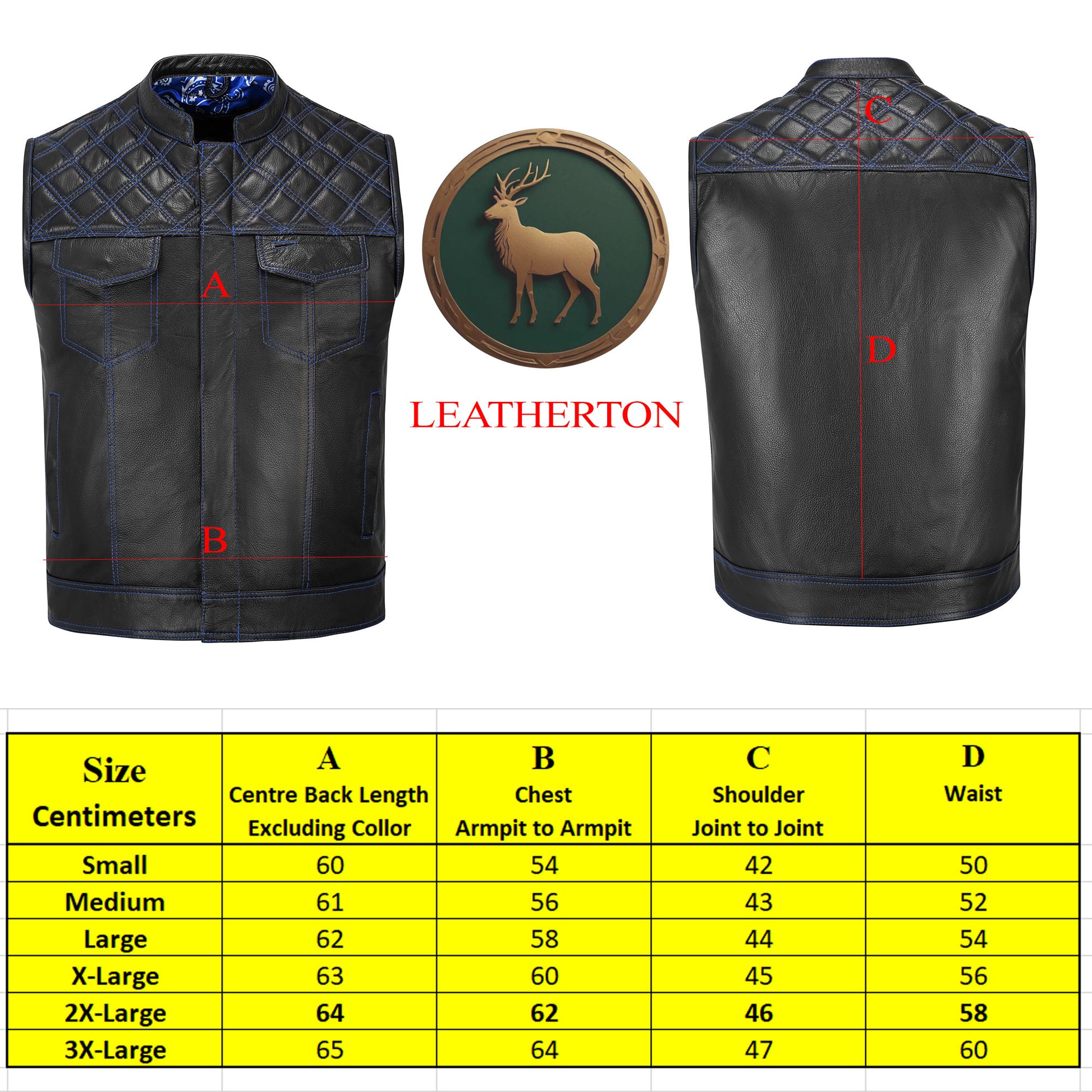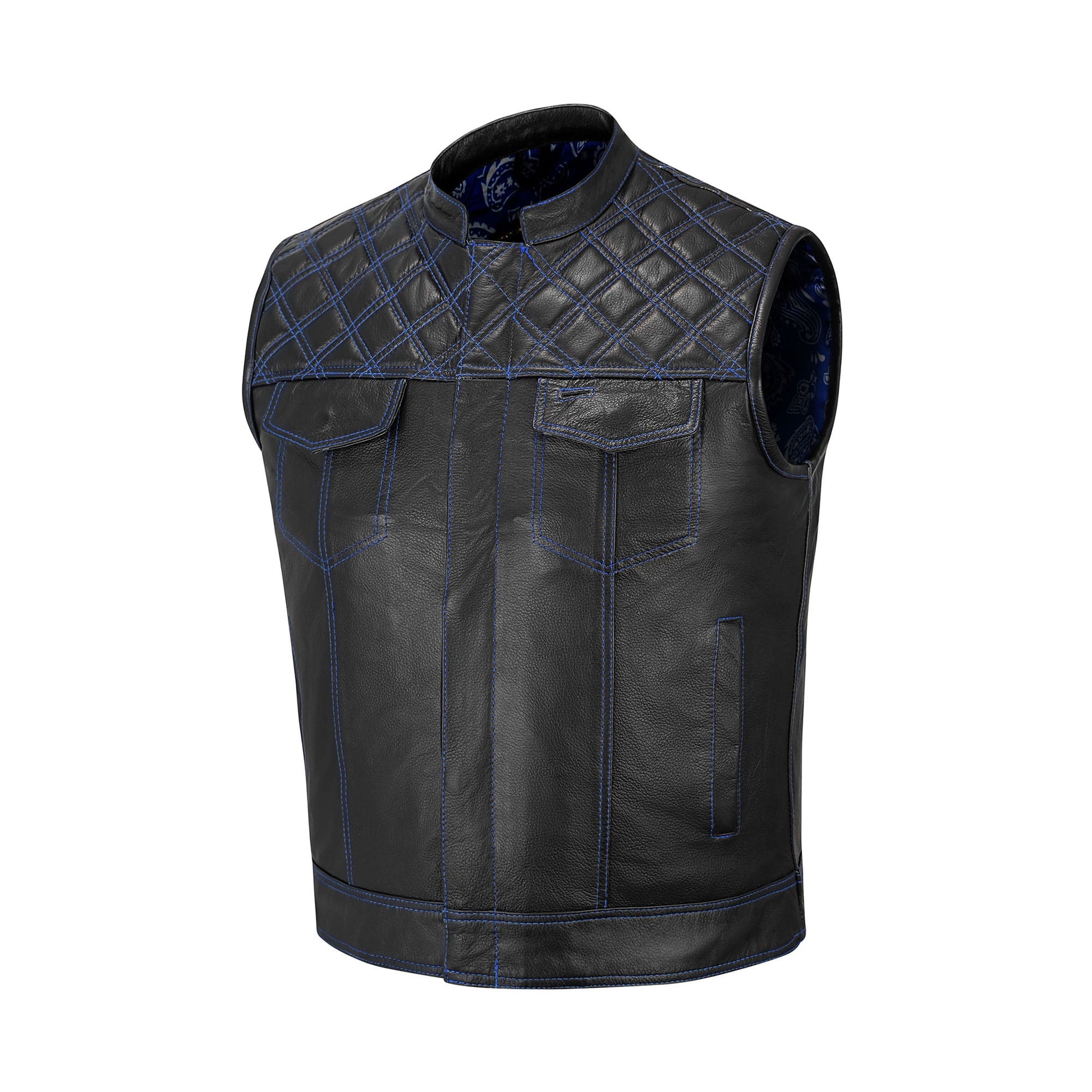 Handcrafted from A+ grade genuine cowhide leather, this Blue Diamond Stitched MC Club Vest is designed for riders who demand both durability and standout style. Featuring bold diamond stitching in blue and a satin-printed lining, it combines rugged biker aesthetics with unmatched comfort. The vest is tailored for motorcycle club members, rebels, and enthusiasts who value craftsmanship and individuality. With secure YKK brass zipper closure, dual chest pockets, and optional concealed carry inner pockets, this customizable vest is ideal for personal use or as a gift for dad, boyfriend, or fellow riders. Choose from multiple colors, patch options, and sizes to make it truly yours.